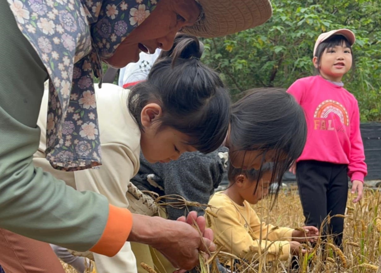 becenge/小米成熟的日子到了,Dawkui 的 kaingu /祖母邀請教室的大家,幫忙她一起收成。