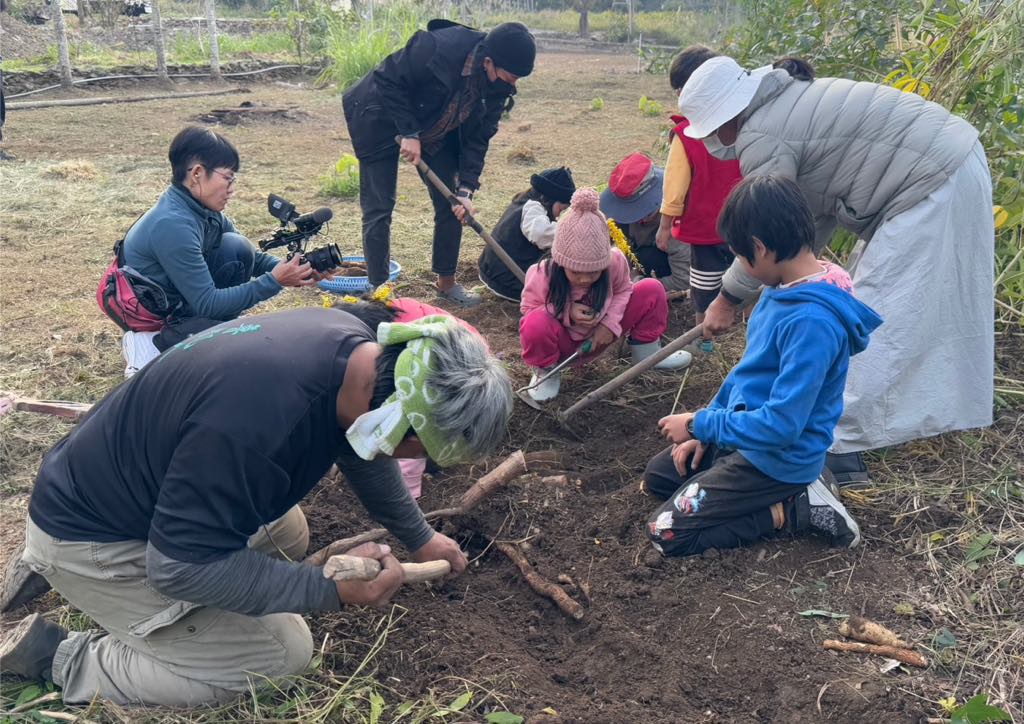 採收完畢,大家一起在工寮裡收尾休息,吃地瓜、喝湯,跑跑跳跳小小搗蛋之後,就跟著我們的 acebe