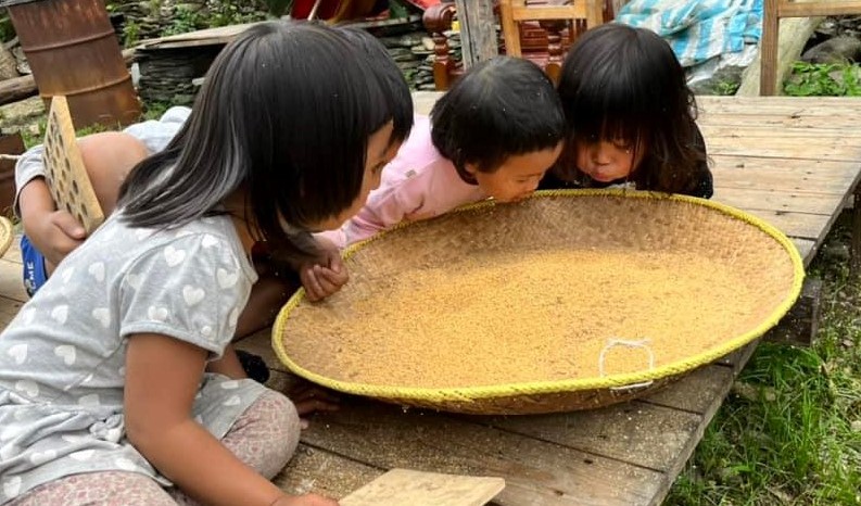 4/7 小小的腳練習踩、讓小米脫殼,並用手跟膝蓋來 watapusu(讓風吹過,讓米糠分離)。